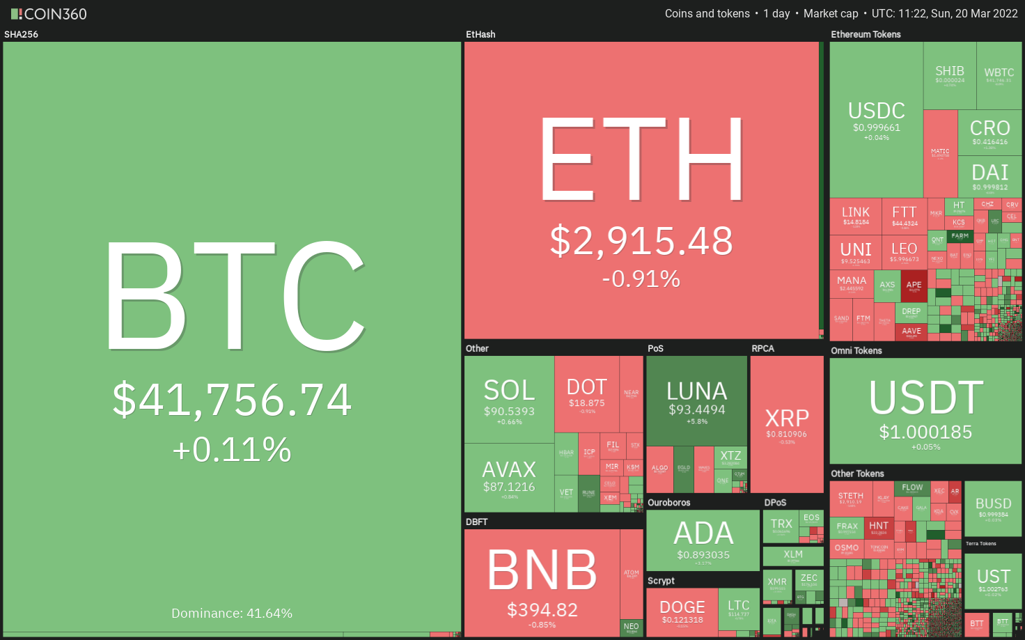 Terra’s LUNA token rebounded off the 20-day EMA ($86) on March 18, indicating strong buying at lower levels. Both moving averages are sloping up and the relative strength index (RSI) is in the positive territory, indicating an advantage to buyers.