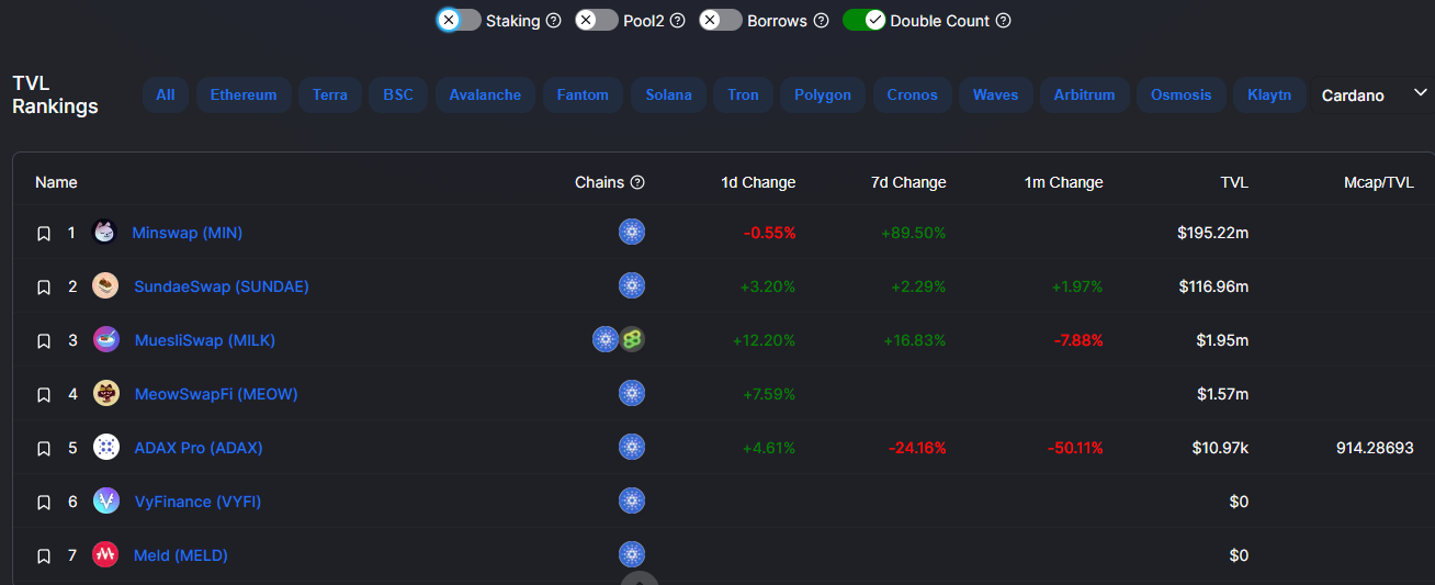 Including the value of staked tokens, the ecosystem’s TVL now sits at an all-time high of $315.7 million with the Minswap DEX leading all other dApps with $195.2 million. That makes Cardano the 25th-largest blockchain network by TVL. If counting the value of staked governance tokens, Cardano’s TVL is about $421.5 million.