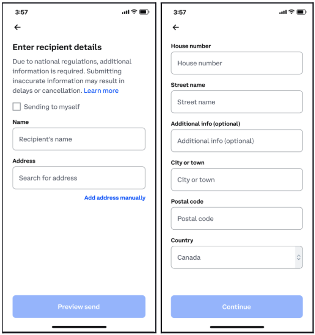Screenshot of Coinbase requesting recipient information from Canadian users. Source: Coinbase