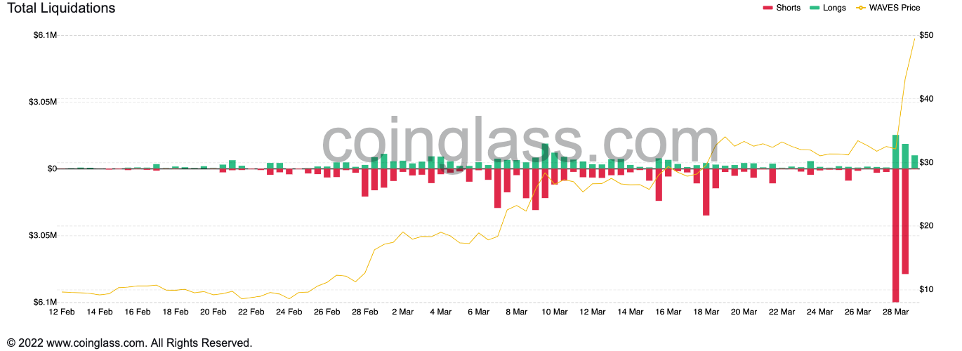 WAVES price surged by up to 70% on March 29, reaching a new all-time high around $54. Traders betting against the rise of Waves — the native token of the WAVES blockchain network — suffered losses worth millions of dollars as the WAVES/USD pair extended its recovery to a record level in the past 24 hours.