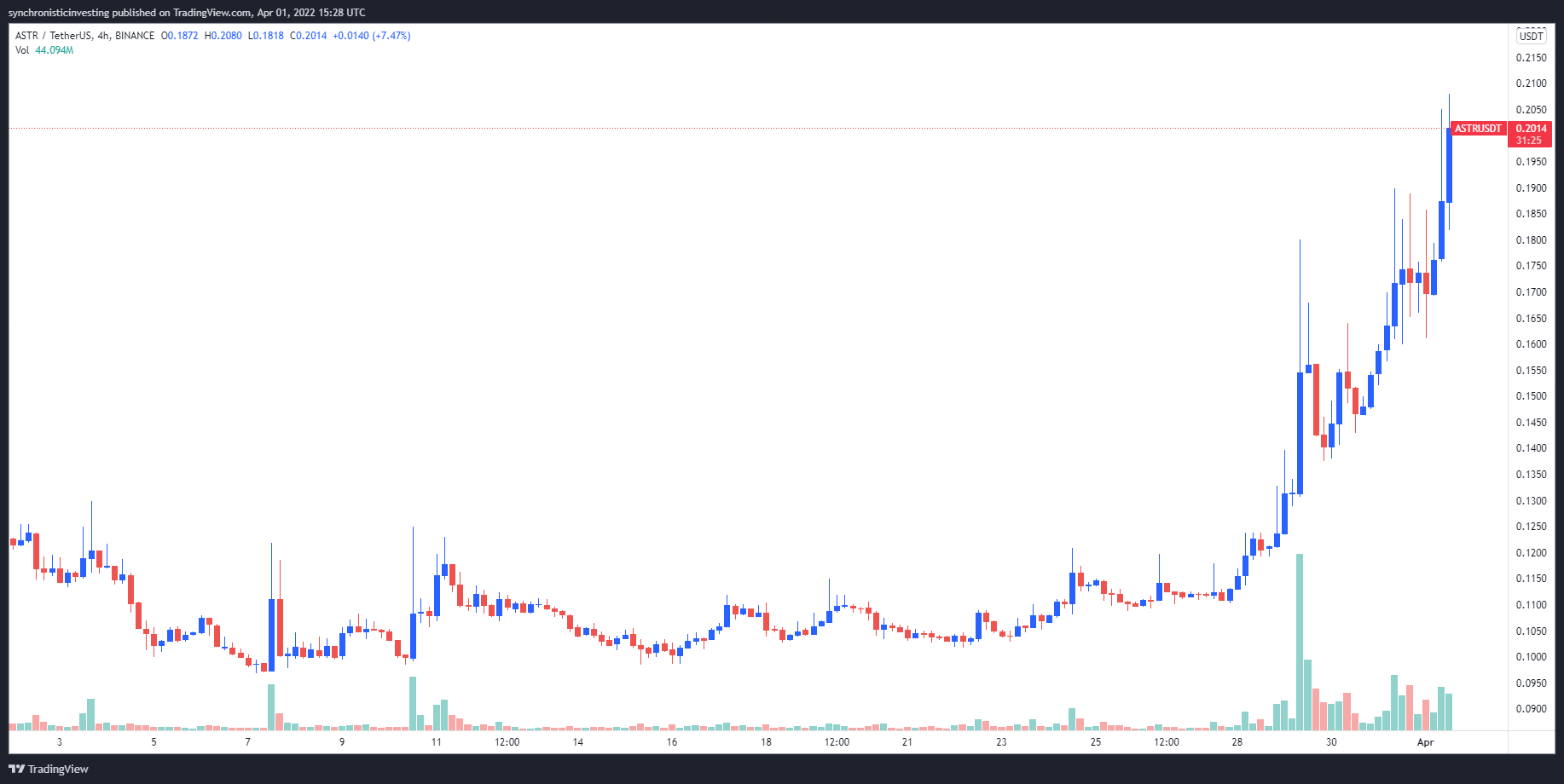 Data from Cointelegraph Markets Pro and TradingView shows that after hitting a low of $0.107 on March 22, the price of ASTR has climbed 104% to a daily high at $0.208 on April 1 as demand for the token increased 20-fold.