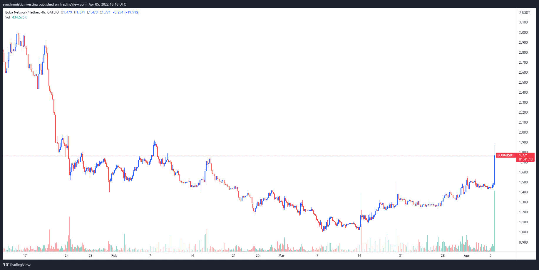 Data from Cointelegraph Markets Pro and TradingView shows that BOBA has gained 50.71% over the past week and a half after climbing from a low of $1.24 on March 27 to a daily high at $1.873 on April 5.