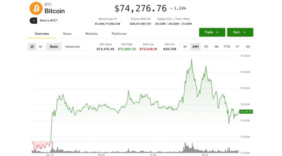 After briefly topping $76,000 — a key resistance level — the largest crypto reversed course, slipping below $74,000 later in the session. It still held onto a 1.3% gain over the past 24 hours, recently changing hands near $74,300.